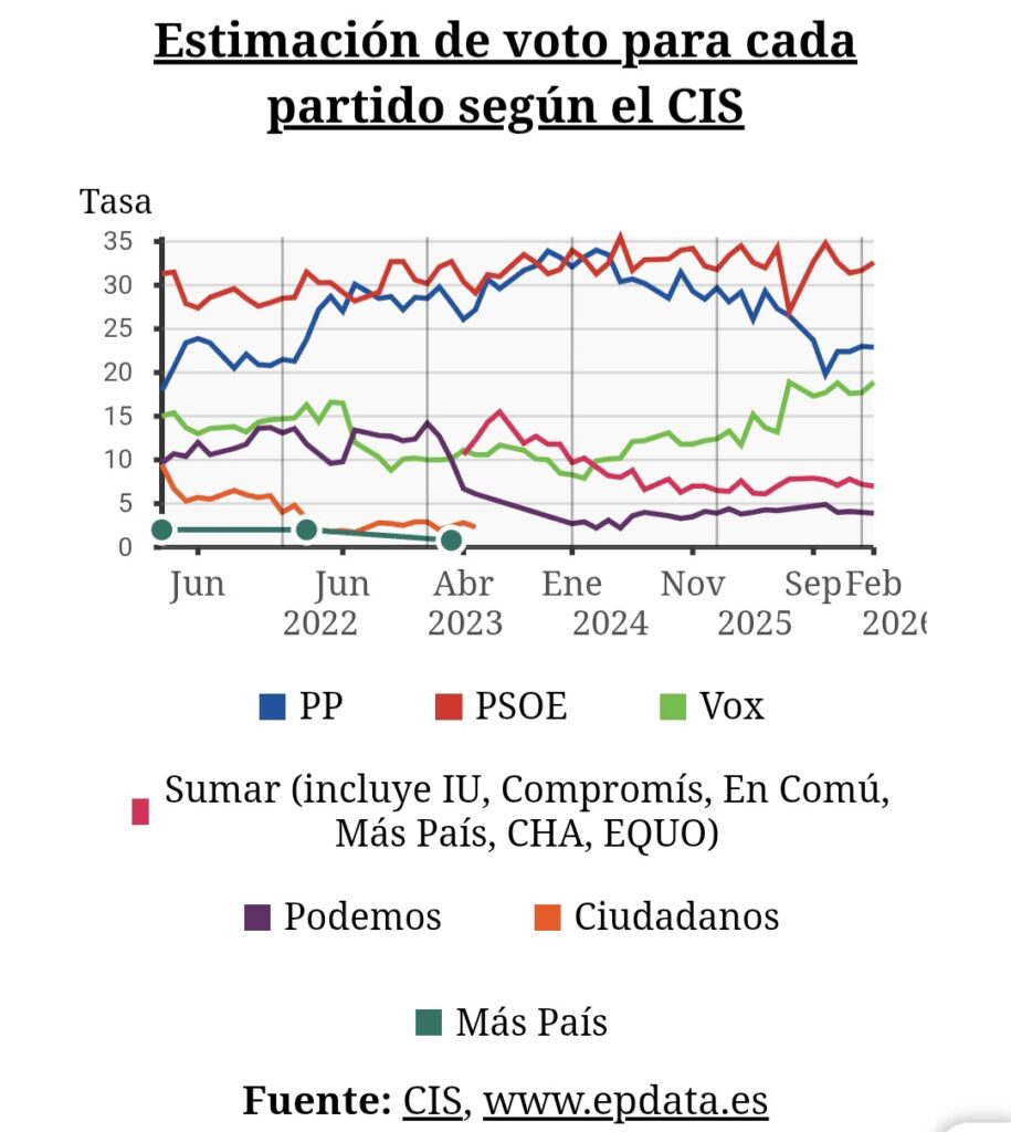 Este barómetro también señala que Vox mejora sus resultados y pasa del 17,7% al 18,9% (1,2 puntos más). Por el contrario, Sumar, en pleno proceso de refundación, pierde apoyos y cae del 7,2% de enero al 7% de este último sondeo. Por su parte, Podemos sube y pasa del 3,5% al 3,9%.