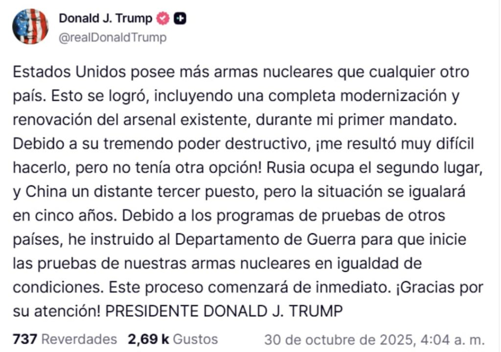 Debido a los programas de pruebas de otros países, he ordenado al Departamento de Guerra que comience a probar nuestras armas nucleares en igualdad de condiciones», manifestó., agregando que «ese proceso comenzará de inmediato».