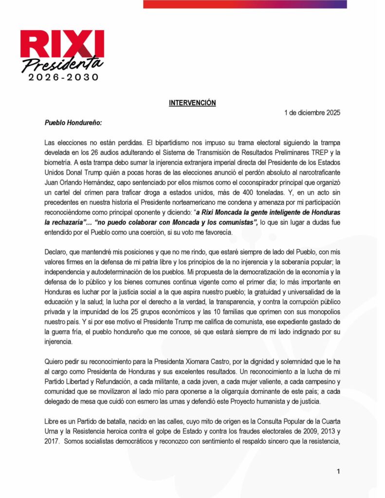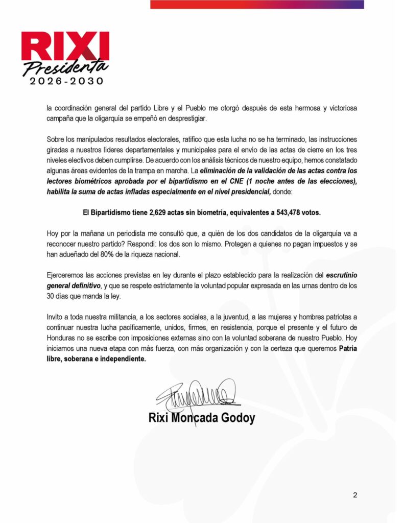 “Haremos las acciones previstas en ley durante el plazo establecido para la realización del escrutinio general definitivo y que se respete estrictamente la voluntad popular expresada en las urnas dentro de los 30 días que manda la ley, invitó a toda nuestra militancia a los sectores sociales a la juventud a las mujeres y hombres patriotas a continuar nuestra lucha pacíficamente, unidos firmes en resistencia porque el presente y el futuro de Honduras no se escribe con imposiciones externas sino con la voluntad soberana de nuestro pueblo” declaró.