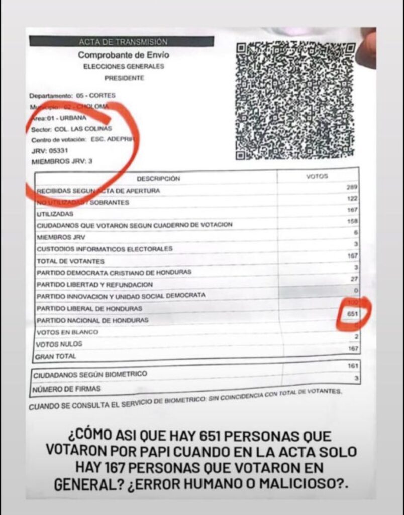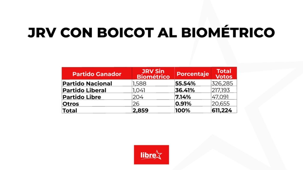 “ De esas actas sin biométricos el Partido Nacional ( ultraderecha) tiene 1.588 y en esas 1.588 actas hay 326,285 votos; El partido Liberal tiene 1.441 actas sin biométrico y en esas 1441 actas hay 297,193 votos estas actas que exponemos y que forman parte del proceso de revisión técnica que se está haciendo lo que significa es que la acta tiene más votos de los que debería y hay casos extremos en donde la acta tiene hasta 100 votos más de lo que debería, nosotros vamos a exigir en este periodo de los 30 días del escrutinio general que se revisen esas actas y vamos a ejercer el uso de los recursos” expuso.