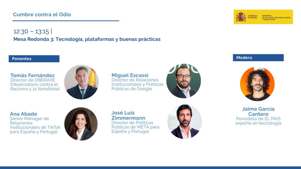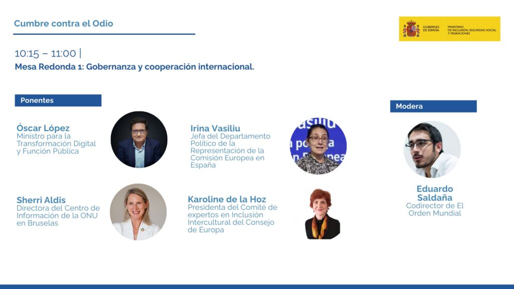 La primera mesa redonda: Gobernanza y cooperación internacional, abordará las necesidades del futuro para monitorizar y combatir los discursos de odio en el entorno digital.Con la presencia del Gobierno de España, representantes de la ONU, Comisión Europea y Consejo de la UE