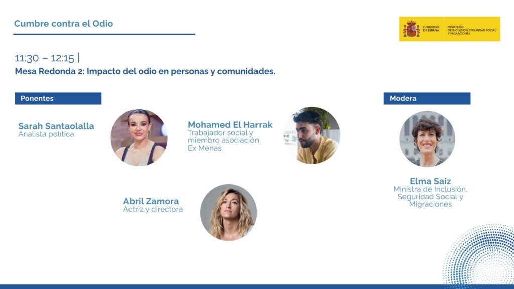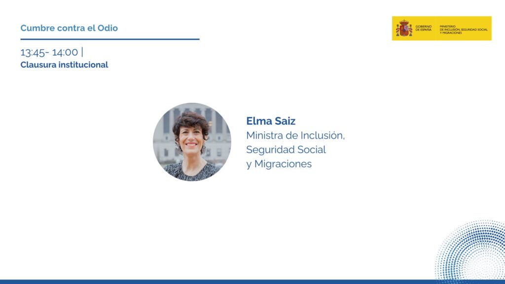 Clausurará la jornada la ministra de Inclusión, Seguridad Social y Migraciones Elma Saiz, con un repaso a las conclusiones de esta I Cumbre contra el Odio.
