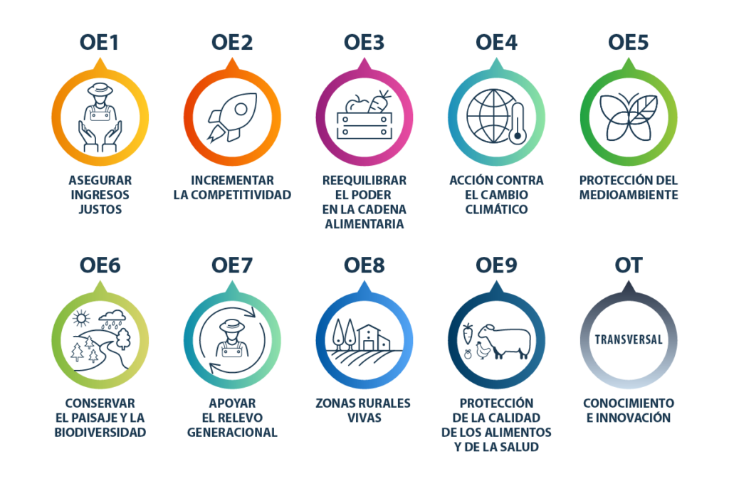El Plan Estratégico Nacional de la Política Agrícola Común (PAC) de España 2023-2027 tiene como objetivo el desarrollo sostenible de la agricultura, la alimentación y las zonas rurales para garantizar la seguridad alimentaria de la sociedad mediante un sector competitivo y un medio rural vivo. Incluye tres tipos de ayudas: Ayudas a la renta mediante pagos directos.Medidas de mercado o programas sectoriales.