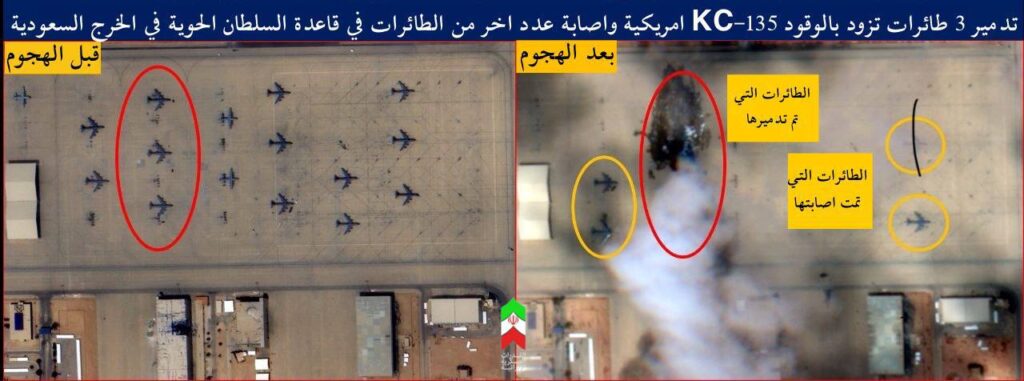 Lo que está confirmado y cierto son las Imágenes satelitales que muestran varios aviones de EEUU dañados en la base aérea de Al Sultan en Arabia SauditaEn particular, se puede ver que al menos dos aviones cisterna KC-135 resultaron dañados tras ser alcanzados por los misiles iraníes mientras estaban estacionados en la capital de Arabia Saudita.